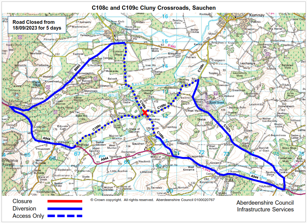 The council has notified that to allow repair of the carriageway at the Cluny Crossroads, the road will be closed from Monday 18th September through to Friday 22nd September 2023.