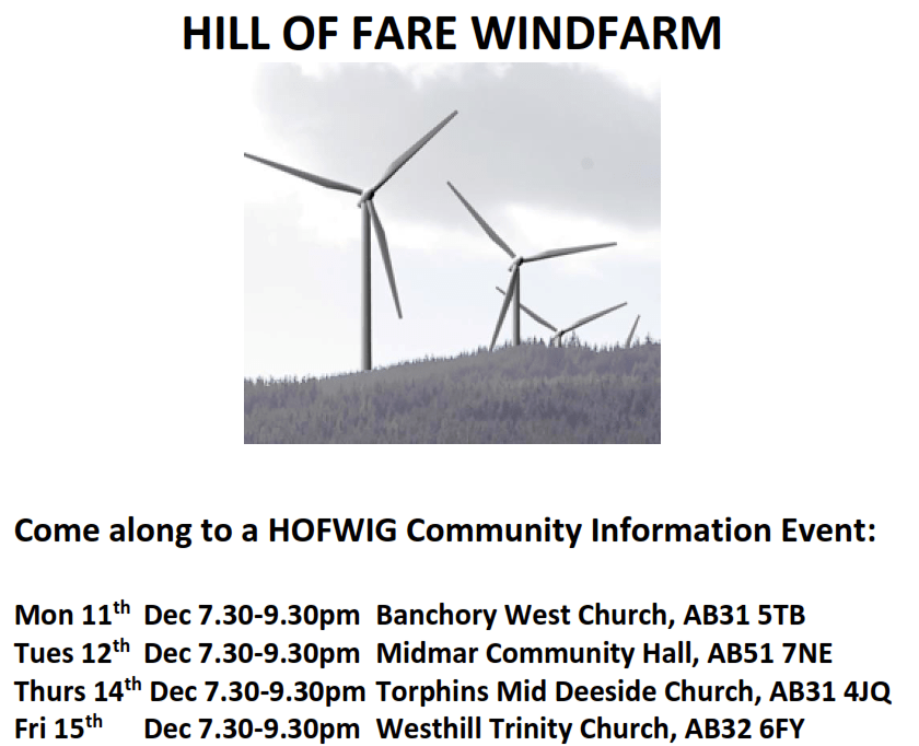 The HoFWIG group will be holding community information meetings on the proposed Hill of Fare Windfarm next week.