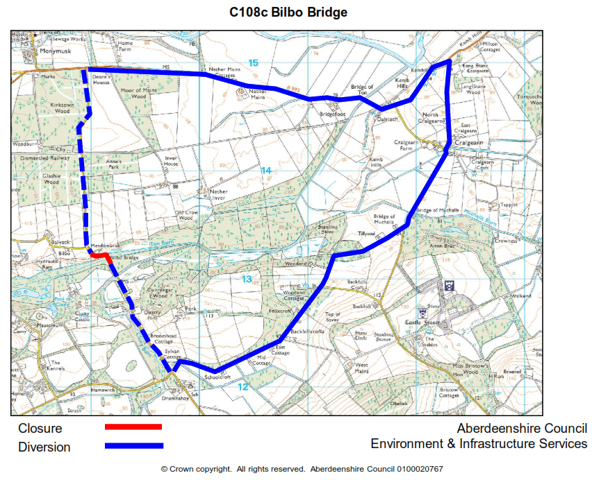 The council has notified that Bilbo Bridge (Cluny to Monymusk Road) will be closed for 10 days from Monday 22nd April 2024; the recommended diversion is given below.