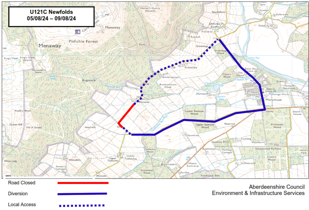 The council has notified that a section of the unclassified road from Newfolds Cottage to Pitmunie (west of Monymusk) will be closed from Monday 5th Aug to Friday 9th August 2024.
