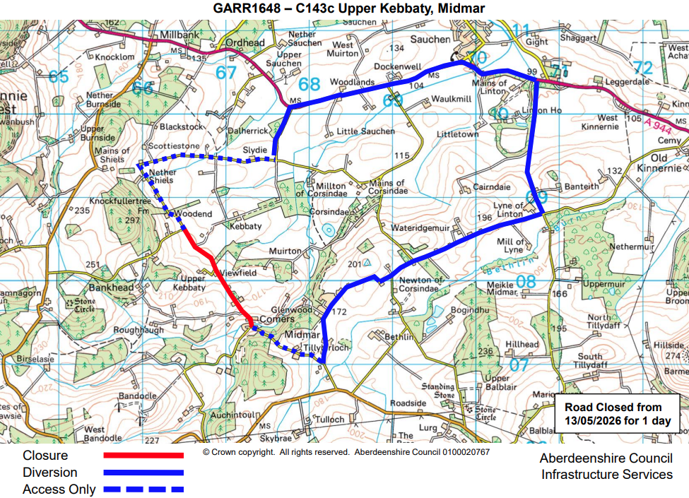 The council has notified that the unclassified road running north from Comers to Bankhead Junction will be closed for one day (Wed 13th May 2026).